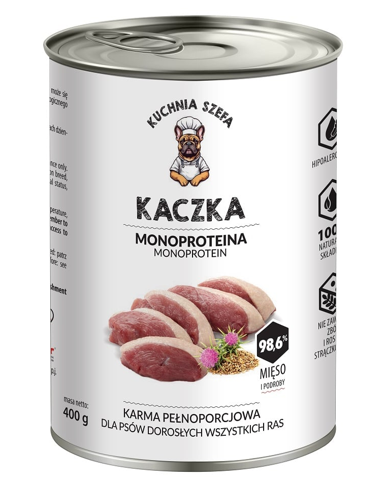 Konyha Szelet Kacsa Monoproteinás egy természetes, magas hús tartalmú étkezés, amelyet felnőtt kutyák számára készítettek, akik értékelik az intenzív ízt és a könnyen emészthető összetevőket. A kacsahús gazdag fehérjében, vasban és vitaminokban, és kiválóan tolerálják az érzékeny emésztőrendszerű kutyák. Ez ideális megoldás mind a válogatós, mind az allergiás kutyák számára.