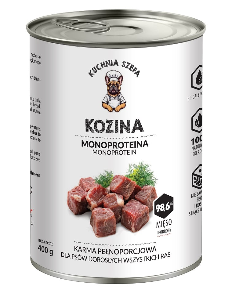 Kuchnia Szefa Kozina Monoproteinowa egy természetes, magas hús tartalmú táp, amelyet felnőtt kutyák számára készítettek, különösen érzékeny és ételallergiás kutyák számára. 98,6%-ban kecskehúst tartalmaz – az egyik leghipoallergénabb és könnyen emészthető fehérjeforrás. Az egyszerű, monoprotein receptúra tökéletes választás az eliminációs diétán lévő vagy érzékeny emésztőrendszerű kutyák számára.