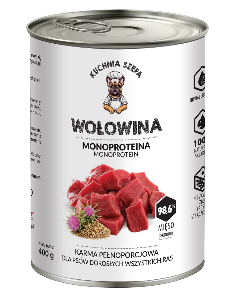 Konyha Szeva Marhahús Monoproteinás egy húsban gazdag, teljes értékű táp, amelyet minden fajtájú felnőtt kutya számára készítettek. A termék 98,6%-ban marhahúst tartalmaz, beleértve az izomhúst és gondosan válogatott belsőségeket, amelyek természetes fehérje-, vitamin- és ásványi anyagforrást jelentenek. Az egyszerű, monoprotein összetevőinek köszönhetően a termék kiválóan alkalmas érzékeny emésztőrendszerű vagy allergiás hajlamú kutyák étrendjéhez is.
