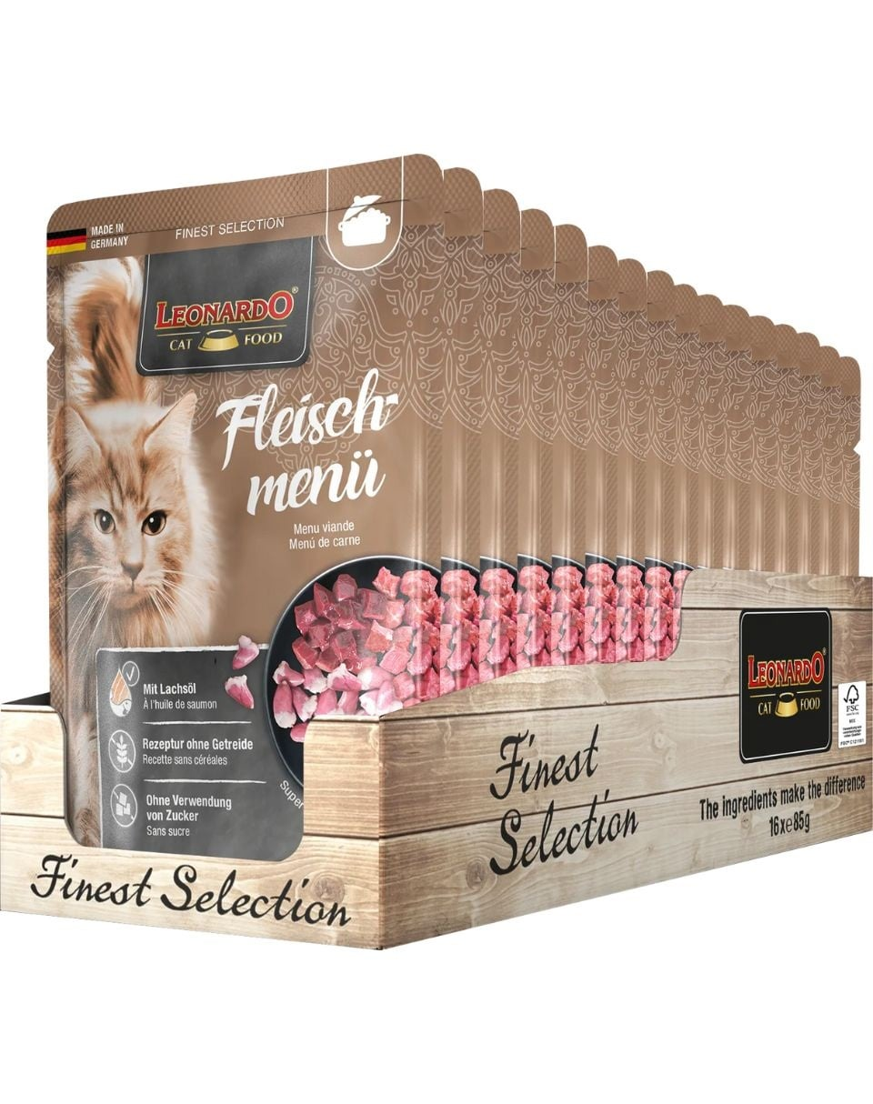 A Finest Selection nedves eledelt ajánlott a Leonardo szárazeledellel kombinálni (20 g szárazeledel körülbelül 1 tasaknak felel meg). Biztosítsa, hogy mindig legyen friss ivóvíz. Felbontás után 24 óráig tárolja a hűtőszekrényben.