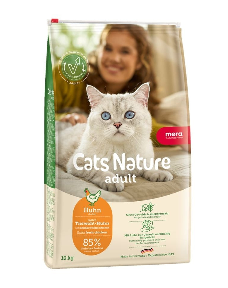 Mera Cats Nature Adult Chicken – természetes élvezet és felelősség egyben! Ajándékozd meg macskádat egészséges, ízletes és kiegyensúlyozott étkezésekkel minden nap.