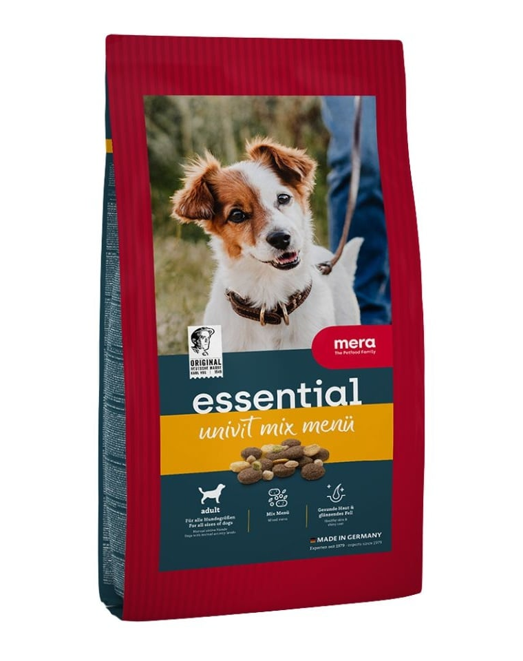 MERA Essential Univit Mix Menu ideális választás felnőtt kutyák számára, akik normál aktivitással bírnak, fajtától függetlenül. A bevált családi receptek alapján készült, magas ízletességet, egészséges összetevőket és teljes napi tápértéket ötvöz.