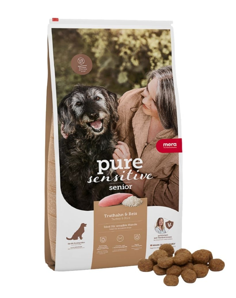 MERA Pure Sensitive Senior Turkey & Rice – Száraz táplálék idősebb, érzékeny kutyák számáraMERA Pure Sensitive Senior Turkey & Rice egy rendkívül ízletes, teljes értékű táplálék idősebb kutyák számára, akiknek különleges táplálkozási igényeik vagy érzékeny gyomruk van. Pulyka és rizs alapú, ideális a táplálék intoleranciával, allergiával és emésztési problémákkal küzdő kutyák számára.