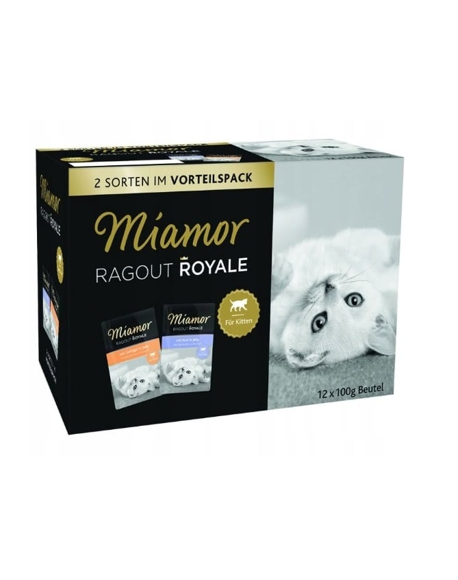 A készlet 12 db 100 g-os tasakot tartalmaz, ebből 6 x baromfi, 6 x marhahús.