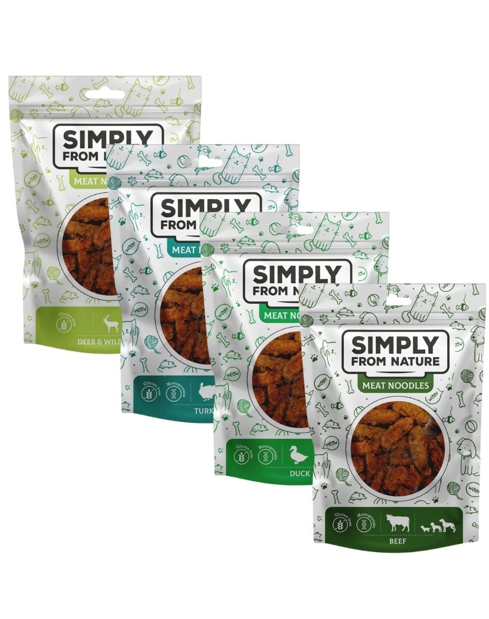 SIMPLY FROM NATURE Húsos tészta Kutyáknak 4x80 g-os vegyes ízesítésű készlet tartalmaz: