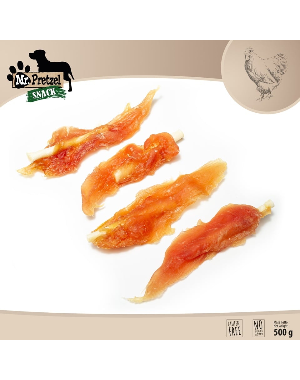 A Mr. Pretzel márkájú csirke filé pálcán egy különösen ízletes, egészséges és aromás rágcsálnivaló minden fajtájú kutya számára.