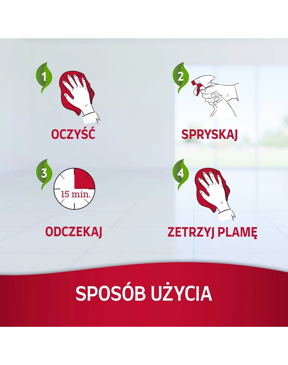 Folt- és szagtalanító: tisztítsa meg a foltot, amennyire csak tudja, majd alaposan itassa át a szennyezett területet a termékkel. Az áztatás azért fontos, mert így a termék mélyebbre hatolhat. Hagyja hatni 15 percig, majd tiszta ruhával szárítsa meg a foltot.