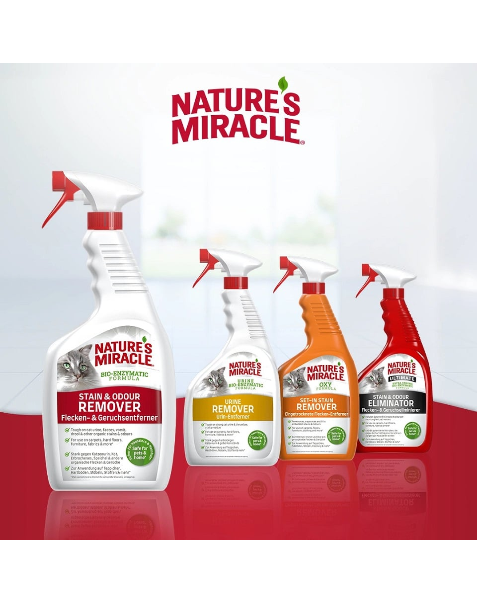 A Nature's Miracle® Folt- és szagtalanítót úgy tervezték, hogy könnyen eltávolítsa a mindennapi macskafoltokat. A bio-enzimatikus, baktérium alapú formula enzimeket termel, amelyek eltávolítják a szerves foltokat, és addig működik, amíg a foltok és a kellemetlen