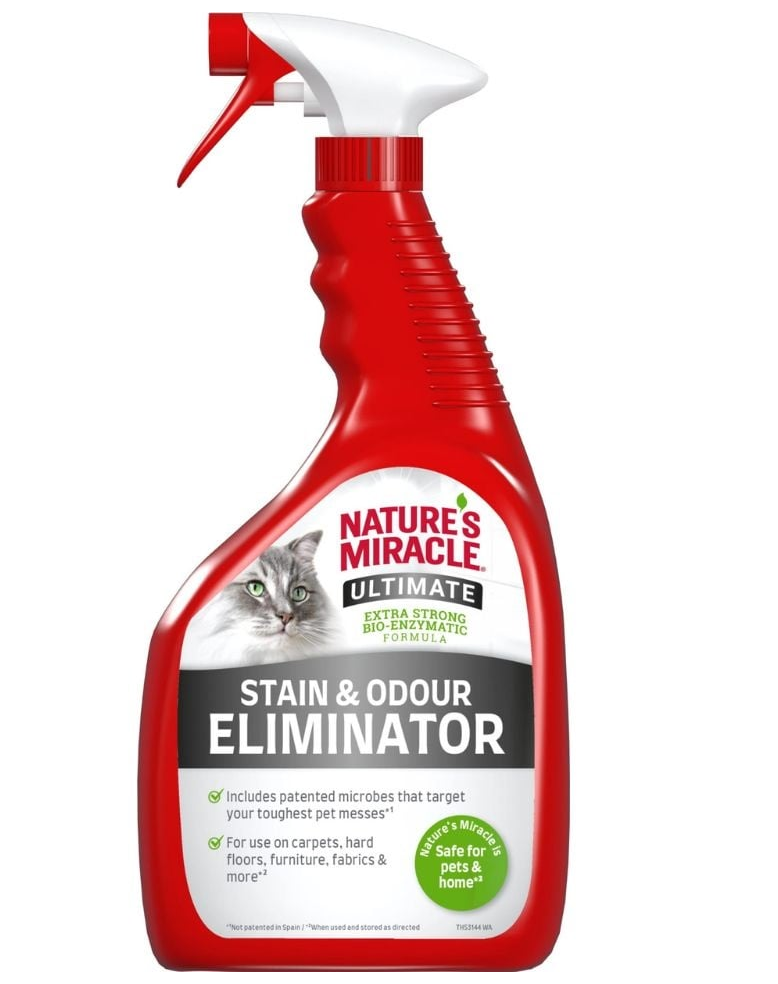 A NATURE'S MIRACLE ULTIMATE Stain & Odour Remover Cat hatékony folt- és szagtalanító a macskák által hátrahagyott kemény szennyeződések eltávolítására. Továbbfejlesztett bio-enzimatikus formulája szabadalmaztatott mikroorganizmusokat tartalmaz, amelyek még a legnehezebb foltok, például vizelet, ürülék és hányás ellen is felveszik a harcot. Ez a termék semlegesíti a macskák által hátrahagyott kellemetlen szagokat is. Használható szőnyegeken, padlókon, bútorokon, szöveteken és egyéb felületeken. Fontos, hogy biztonságos mind a háziállatok, mind az otthon számára. Emellett könnyű és friss illatának köszönhetően frissítő hatású.