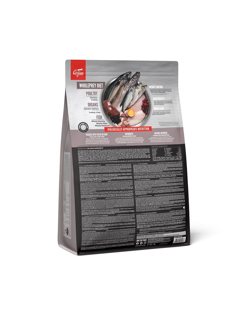 Friss csirke (20%), friss csirke belsőségek (máj, szív) (11%), nyers egész hering (8%), nyers pulyka (6%), nyers egész szürke tőkehal (5%), friss tojás (5%), nyers egész makréla (4%), dehidratált csirke (4%), dehidratált pulyka (4%), dehidratált makréla (4%), dehidratált szardínia (3%), dehidratált hering (3%), dehidratált fehérhal (3%), nyers pulykamáj (3%), lencse rost, egész vörös lencse, egész zöld lencse, egész borsó, egész csicseriborsó, egész pinto bab, borsókeményítő, egész tengerészbab, dehidratált kék puha tőkehal (1%), csirkezsír (1%), almaszál, szárított tengeri alga, alga (DHA-forrás), friss egész sütőtök, friss egész pézsma, friss egész cukkini, friss egész sárgarépa, friss egész alma, friss egész körte, szárított cikóriagyökér, friss kelkáposzta, friss spenót, friss cékla, friss fehérrépa, egész áfonya, egész áfonya, egész saskatoon bogyó, kurkuma, máriatövis, bojtorjángyökér, levendula, magyal, csipkebogyó.