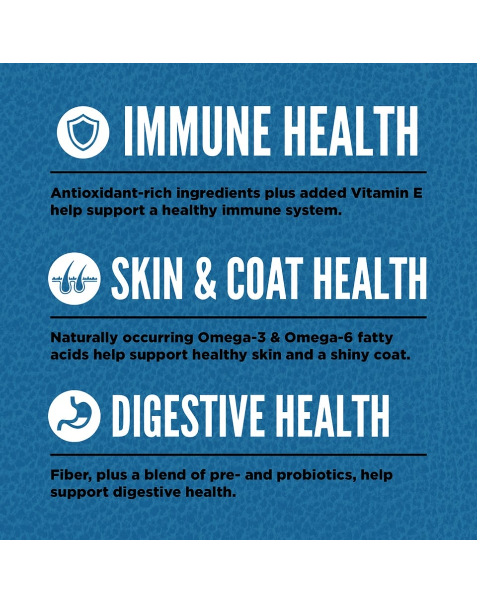 Friss csirke (25%), nyers pulyka (8%), friss csirkemell (máj, szív) (7%), egész nyers hering (6%), egész nyers szürke tőkehal (5%), friss tojás (5%), nyers pulykamáj (5%), dehidratált csirke (4%), dehidratált pulyka (4%), dehidratált makréla (4%), dehidratált szardínia (4%), dehidratált hering (4%), egész vörös lencse, egész csicseriborsó, egész borsó, csirkezsír (3%), egész zöld lencse, egész pinto bab, egész tengerészbab, lencse rost, tőkehalolaj (1%), borsókeményítő, szárított tengeri alga, friss egész sütőtök, friss egész pézsmahús, friss egész cukkini, friss egész sárgarépa, friss egész alma, friss egész körte, szárított cikóriagyökér, friss kelkáposzta, friss spenót, friss cékla, friss fehérrépa, egész áfonya, egész áfonya, egész saskatoon bogyó, kurkuma, máriatövis, bojtorjángyökér, levendula, magyal, csipkebogyó.