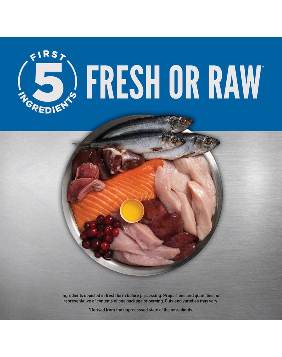 Friss csirke (25%), nyers pulyka (8%), friss csirkemell (máj, szív) (7%), egész nyers hering (6%), egész nyers szürke tőkehal (5%), friss tojás (5%), nyers pulykamáj (5%), dehidratált csirke (4%), dehidratált pulyka (4%), dehidratált makréla (4%), dehidratált szardínia (4%), dehidratált hering (4%), egész vörös lencse, egész csicseriborsó, egész borsó, csirkezsír (3%), egész zöld lencse, egész pinto bab, egész tengerészbab, lencse rost, tőkehalolaj (1%), borsókeményítő, szárított tengeri alga, friss egész sütőtök, friss egész pézsmahús, friss egész cukkini, friss egész sárgarépa, friss egész alma, friss egész körte, szárított cikóriagyökér, friss kelkáposzta, friss spenót, friss cékla, friss fehérrépa, egész áfonya, egész áfonya, egész saskatoon bogyó, kurkuma, máriatövis, bojtorjángyökér, levendula, magyal, csipkebogyó.
