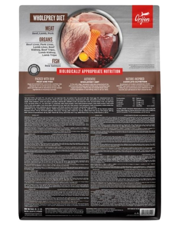 ÖSSZETÉTEL: nyers marhahús (18,5%), nyers bárány (7%), nyers sertés (7%), nyers marhamáj (5%), nyers lazac (5%), nyers sertésmáj (5%), friss tojás (5%), dehidratált bárány (5%), dehidratált marhahús (5%), dehidratált hering (5%), egész vörös lencse, egész pinto bab, dehidratált sertéshús (3,5%), dehidratált szardínia (3,5%), egész zöld lencse, egész csicseriborsó, egész fehérbab, lencse rost, marhafaggyú (2%), fehérhalolaj (2%), nyers báránymáj (1,5%), nyers marhavese (1,5%), nyers marhagyomor (1,5%), nyers bárányvese (1%), nyers báránygyomor (1%), szárított hínár, friss egész sütőtök, friss egész pézsmahús, friss egész cukkini, friss egész sárgarépa, friss egész alma, friss egész körte, szárított cikóriagyökér, friss kelkáposzta, friss spenót, friss céklalevél, friss fehérrépalevél, egész áfonya, egész áfonya, egész saskatoon bogyó, kurkuma, máriatövis, bojtorjángyökér, levendula, valeriánagyökér, csipkebogyó.