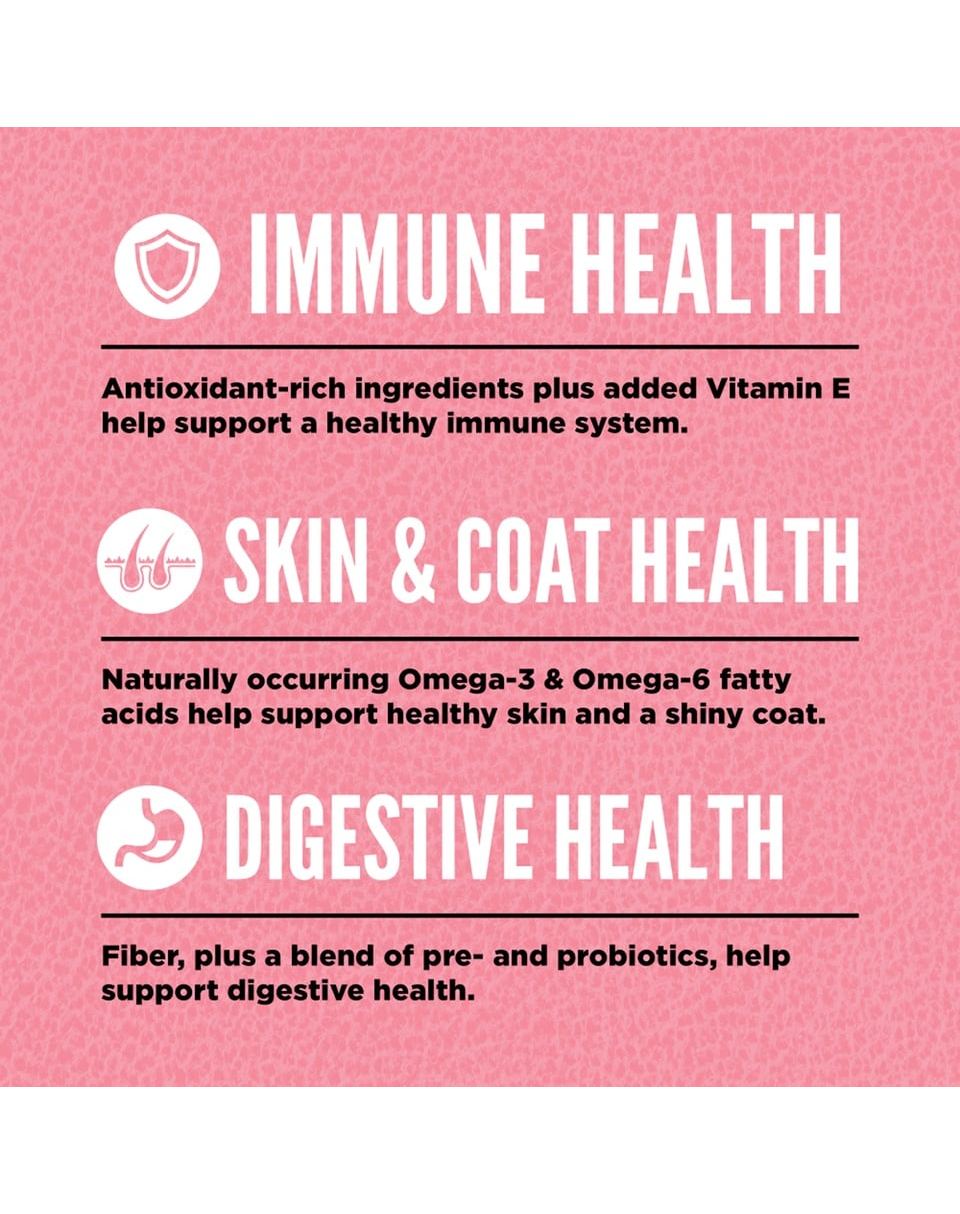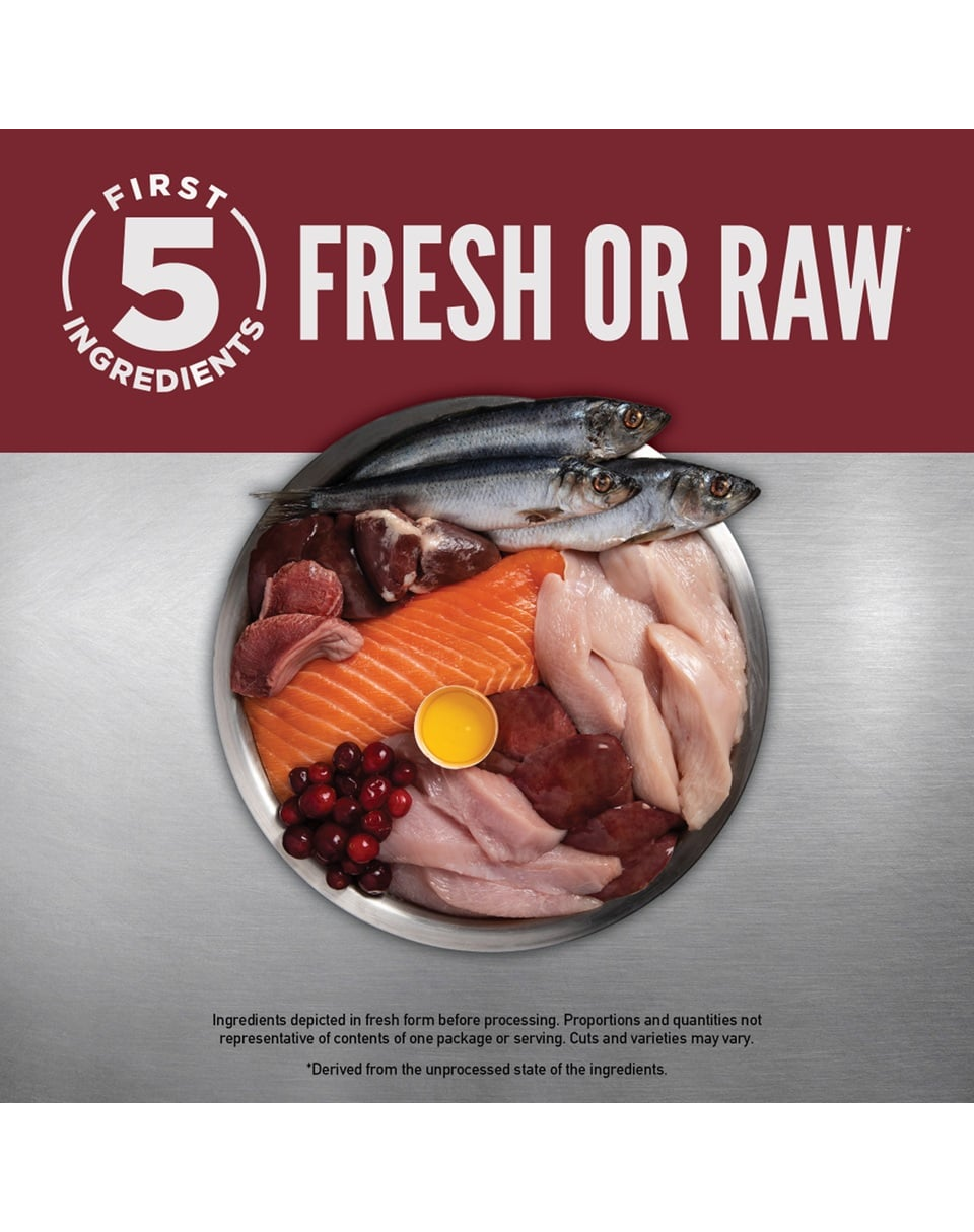 Nyers pulyka (19%), friss csirke (18. 5%), nyers fürj (4%), nyers szürke tőkehal (4%), nyers hering (4%), nyers pulykamáj (4%), friss csirkemell (máj, szív) (4%), friss tojás (4%), dehidratált pulyka (4%), dehidratált csirke (4%), dehidratált hering (4%), dehidratált csirkemáj (4%), dehidratált tojás (4%), egész vörös lencse, egész pinto bab, egész zöld lencse, csirkezsír (3%), egész tengerészbab, egész csicseriborsó, lencse rost, egész borsó, tőkehalolaj (0. 5%), borsókeményítő, szárított tengeri alga, új-zélandi zöldkagyló, friss egész pézsmatök, friss egész sütőtök, só, friss egész alma, friss egész sárgarépa, friss egész körte, friss egész cukkini, szárított cikóriagyökér, friss cékla, friss kelkáposzta, friss spenót, friss fehérrépa, egész áfonya, egész áfonya, egész saskatoon bogyó, kurkuma, máriatövis, bojtorjángyökér, levendula, magyal, csipkebogyó.