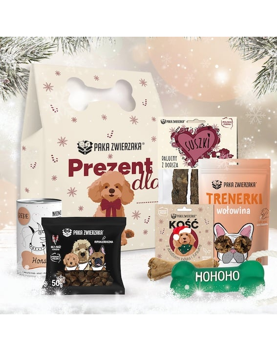 PAKA ZWIERZAKA Karácsonyi doboz kutyáknak egy különleges ajándékcsomag, tele finomságokkal és meglepetésekkel, amelyek miatt a kedvenced farka sosem áll meg!