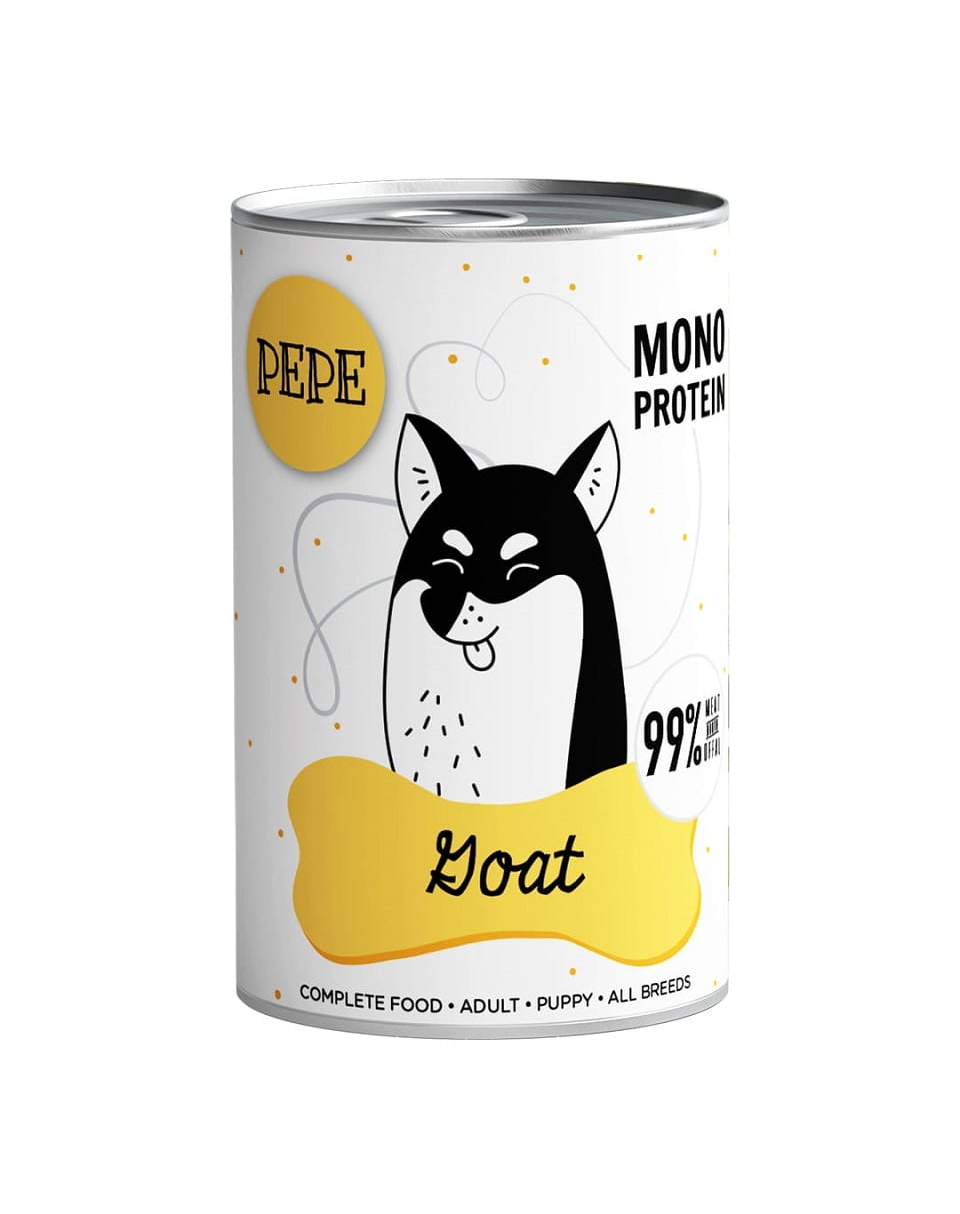 A PAKA ZWIERZAKA PEPE kecskehúsos természetes nedves eledel teljes értékű és kiegyensúlyozott táplálék minden korú kutyák számára. 99% kecskehúst, értékes belsőségeket és húslevest tartalmaz. A legmagasabb minőségű friss alapanyagokból készül. Gazdag tápanyagokban és könnyen emészthető állati fehérjeforrás.