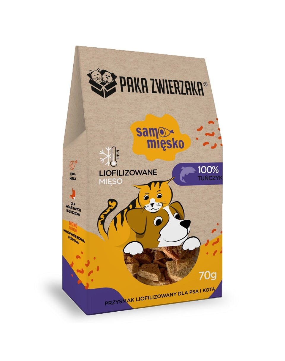 Samo Hús – 100% Tonhal egy kiváló minőségű, egy összetevőből álló finomság kutyák és macskák számára. Csak tonhal filéből készült, csontok, bőr, gabonák, tartósítószerek vagy mesterséges adalékanyagok hozzáadása nélkül. A liofilizálás – azaz alacsony hőmérsékleten történő szárítás – alkalmazásának köszönhetően a termék megőrzi a tápanyagok teljes spektrumát, természetes ízét és aromáját.