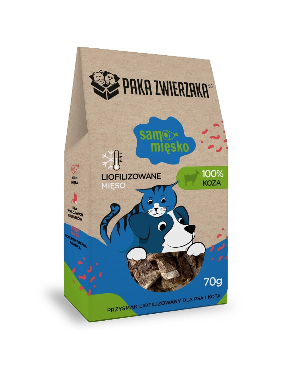Samo Míśko – 100% Kecske egy kiváló minőségű, egy összetevőből álló jutalomfalat kutyák és macskák számára, amely kizárólag kecskehúsból készült. A termék nem tartalmaz tartósítószereket, színezékeket, gabonát vagy bármilyen mesterséges adalékanyagot. A liofilizálás folyamatának köszönhetően a hús megőrzi természetes tápanyagtartalmát, ízét és aromáját, amelyek még a legigényesebb állatokat is vonzzák.