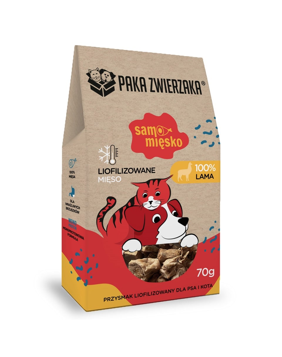 Samo Míśko – 100% Lama egy kiváló minőségű, természetes jutalomfalat kutyák és macskák számára, amely kizárólag lámahúsból készült. A termék teljesen mentes a gabonáktól, tartósítószerektől, mesterséges adalékanyagoktól és töltőanyagoktól. A liofilizálás – azaz a hús alacsony hőmérsékleten történő szárítása – révén megőriztük a tápanyagok teljes értékét, a természetes ízt és a hús aromáját, amelyet még a legigényesebb állatok is értékelni fognak.