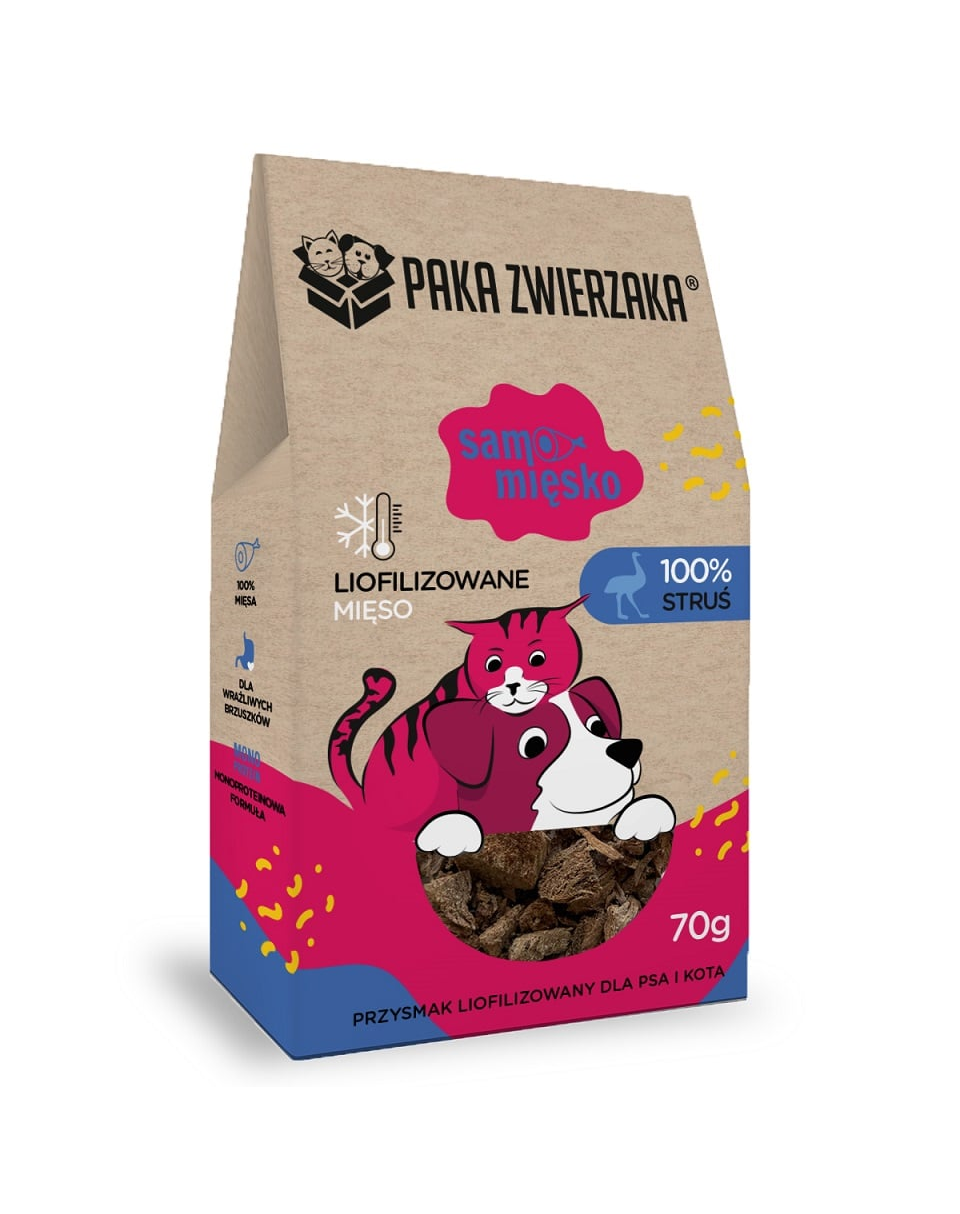 Samo Míśko – 100% Strúsz egy természetes, monoprotein finomság, amely kutyáknak és macskáknak készült. Csak strucc húsból készült, gabonák, tartósítószerek vagy mesterséges anyagok hozzáadása nélkül. A liofilizálás, azaz a fagyasztva szárítás folyamata révén a termék megőrzi a tápanyagok teljes értékét, természetes ízét és aromáját – ami vonzóvá teszi még a legválogatósabb kedvencek számára is.