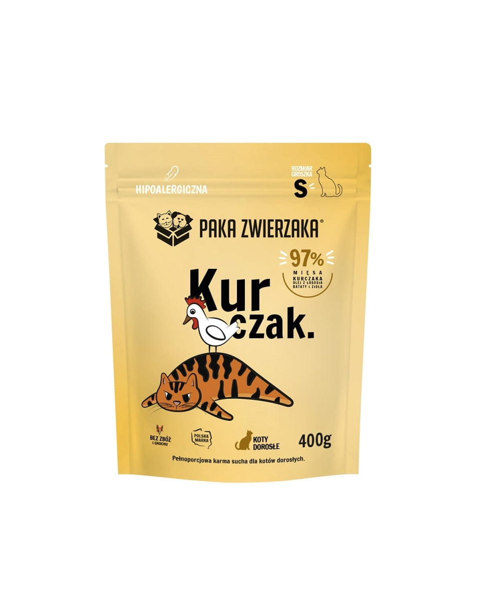 A Paka Zwierzaka Csirke egy kiegyensúlyozott, teljes értékű száraz táp Superpremium osztályú, amelyet felnőtt macskák számára fejlesztettek ki, beleértve a sterilizáltakat is. Az S méretű granulátumok a napi etetéshez lettek igazítva.
