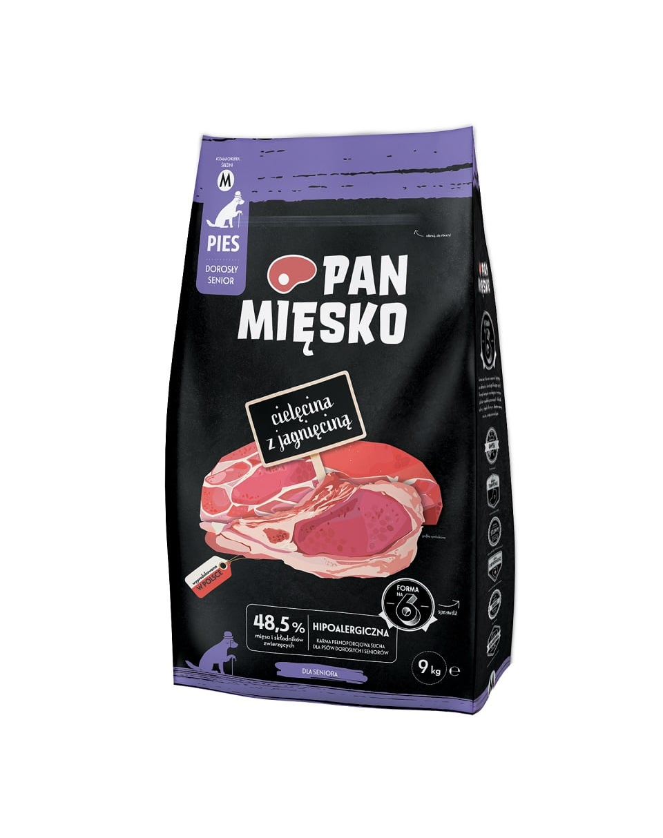 A Pan Mięsko Borjúhús Bárányhússal receptúráját az idősebb kutyák és seniorok specifikus igényei alapján dolgozták ki. Korának megfelelő tápláló fehérjét tartalmaz. A zsírtömeg csökkentése kedvezően hat a máj és a hasnyálmirigy működésére a felnőtt szervezetben. Az Omega-3 zsírsavak, a glükózamin és a kondroitin-szulfát hozzáadása segít a egészséges ízületek támogatásában, míg a taurin a szívet támogatja. Ebben a receptben a tápanyagokban gazdag borsót könnyen emészthető édesburgonyával és burgonyával helyettesítettük. A Yucca Mojave kivonatnak és a MOS és FOS prebiotikumoknak köszönhetően a táp könnyen emészthető és pozitív hatással van az emésztőrendszerre.