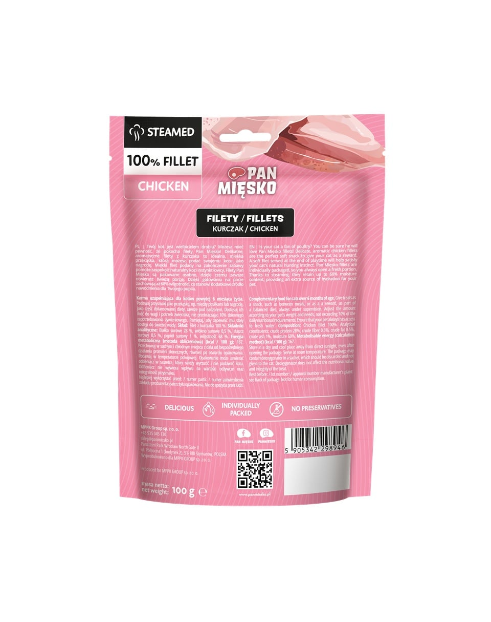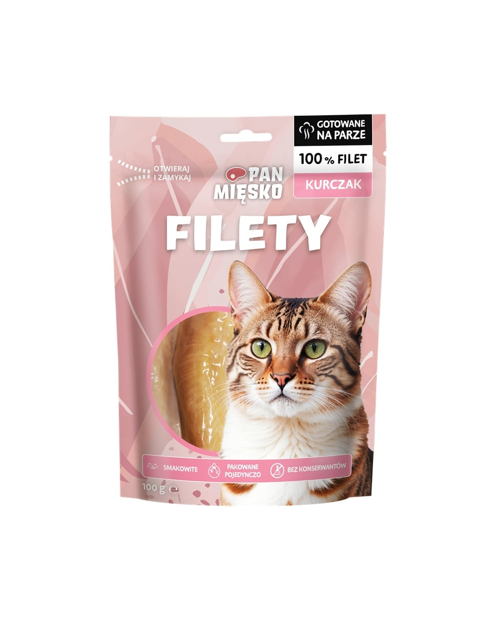 A te macskád szereti az intenzív ízeket? Biztos lehetsz benne, hogy imádni fogja a Pan Mięsko filéket! A lágy, aromás csirke filék ideális, puha falatok, amelyeket jutalomként adhatsz a macskádnak. A játék végén kínált puha filé segít kielégíteni a macskák természetes vadászösztönét. A Pan Mięsko filék külön csomagolva vannak, így mindig friss adagot nyitsz ki. A párolásnak köszönhetően 68%-os nedvességtartalmat megőriznek, ami további hidratálási forrást jelent kedvenced számára.