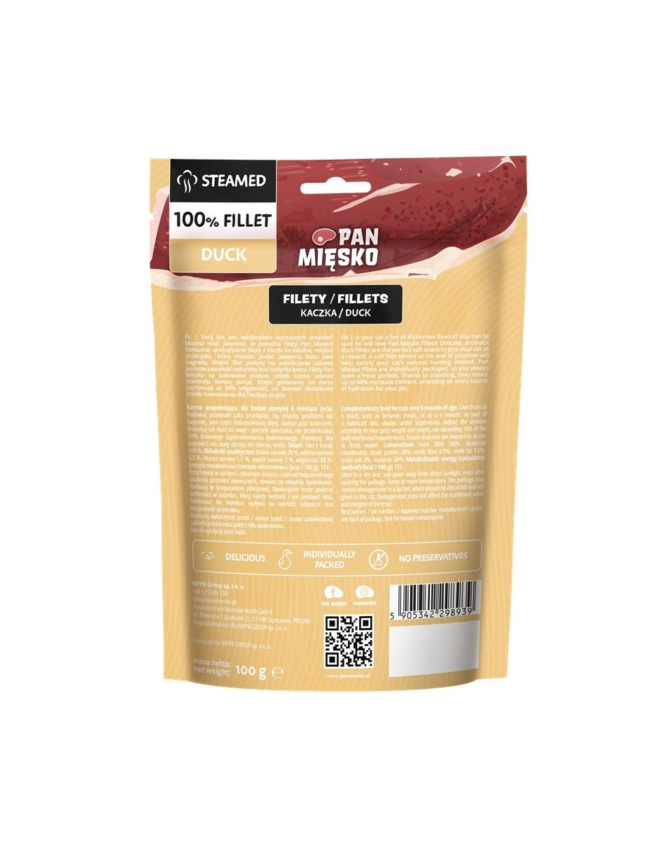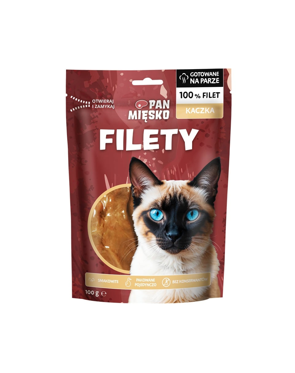 A macskád szereti az intenzív ízeket? Biztos lehetsz benne, hogy imádni fogja a Pan Mięsko filéket! A lágy, aromás kacsafilék ideális, puha falatok, amelyeket jutalomként adhatsz a macskádnak. A játék végén kínált puha filé segít kielégíteni a macskák természetes vadászösztönét. A Pan Mięsko filék egyesével csomagolva vannak, így mindig friss adagot nyithatsz. A párolásnak köszönhetően 68%-os nedvességtartalmat megőriznek, ami további hidratálási forrást jelent kedvenced számára.
