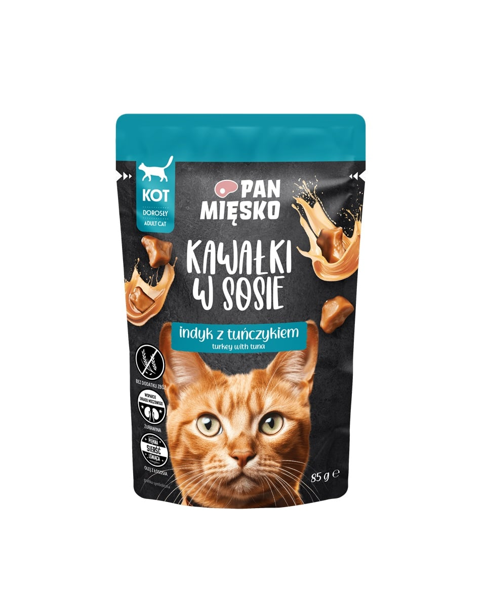 Ízletes darabok finom szószban, amelyek még a legválogatósabb macskákat is leveszik a lábukról! Ez a megfelelően kiegyensúlyozott, húsban gazdag étel teljes értékű napi táplálékot ad kedvenced számára. A receptet lazacolajjal és szárított sörélesztővel dúsították a fénylő szőrzetért, áfonyával a húgyúti rendszer támogatásáért, illetve egészséges gyógynövényekkel.