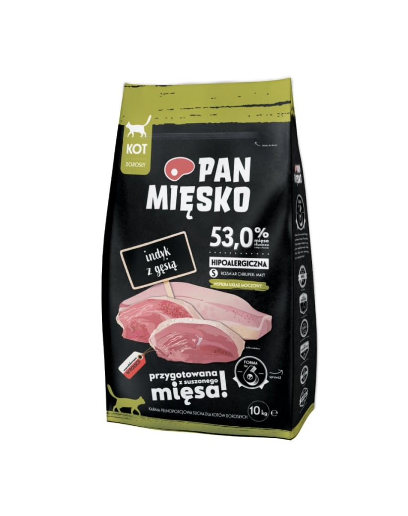 Ismerje meg a hipoallergén Pan Mięsko száraz macskaeledelt. Gondosan válogatott húsok, lédús lengyel alma, egészséges zöldségek és értékes tápanyagok jellemzik, amelyek pozitívan befolyásolják macskája egészségét és kondícióját. Receptjeinket szakemberek állították össze, hogy négylábú társának pontosan azt nyújtsuk, amire szüksége van. Az Ön macskája a legjobbat érdemli.
