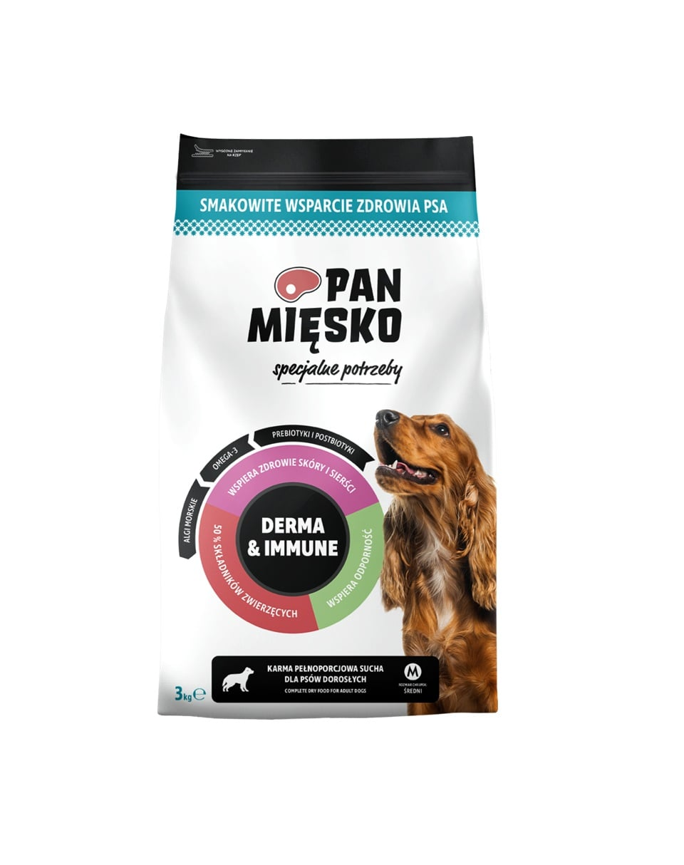 A Derma & Immune felnőtt kutyák számára készült eledel azoknak a kutyáknak ajánlott, amelyeknek támogatásra van szükségük az immunrendszer működésében, illetve hajlamosak az ételintoleranciára. Jótékony hatású prebiotikumokkal és posztbiotikumokkal gazdagítva. A lazacolaj és a tengeri algák hozzáadásának köszönhetően a formula támogatja az egészséges, szép szőrzet fenntartását is.