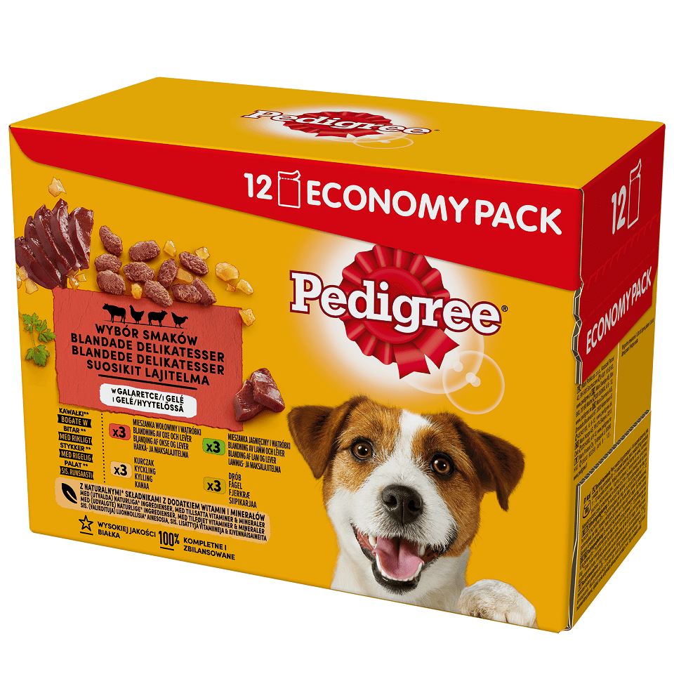 A PEDIGREE Adult Selection of Flavours in Jelly a WALTHAMTM Állattudományi Intézet állatorvosai és táplálkozástudományi szakemberei által kifejlesztett teljes értékű eledel felnőtt kutyák számára. A fehérjében gazdag, ízletes zselébe mártott húsdarabok a legigényesebb kutya ízlését is kielégítik. Kifejezetten mesterséges aromák és tartósítószerek nélkül összeállított, természetes összetevőket, vitaminokat és ásványi anyagokat tartalmaz. Az eledelben található E-vitamin támogatja kedvence immunrendszerét. Az élelmi rostok támogatják a bélműködést az egészséges emésztés érdekében, a csökkentett kalóriatartalomnak* köszönhetően pedig karcsú marad a kedvence. A csomag 4 ízben tartalmaz: 3x darab marhahús és májkeverékben gazdag, 3x darab csirkehúsban gazdag, 3x darab bárányhús és májkeverékben gazdag és 3x darab baromfihúsban gazdag.