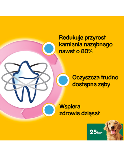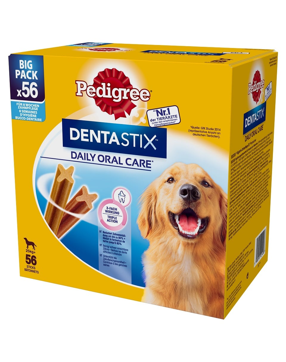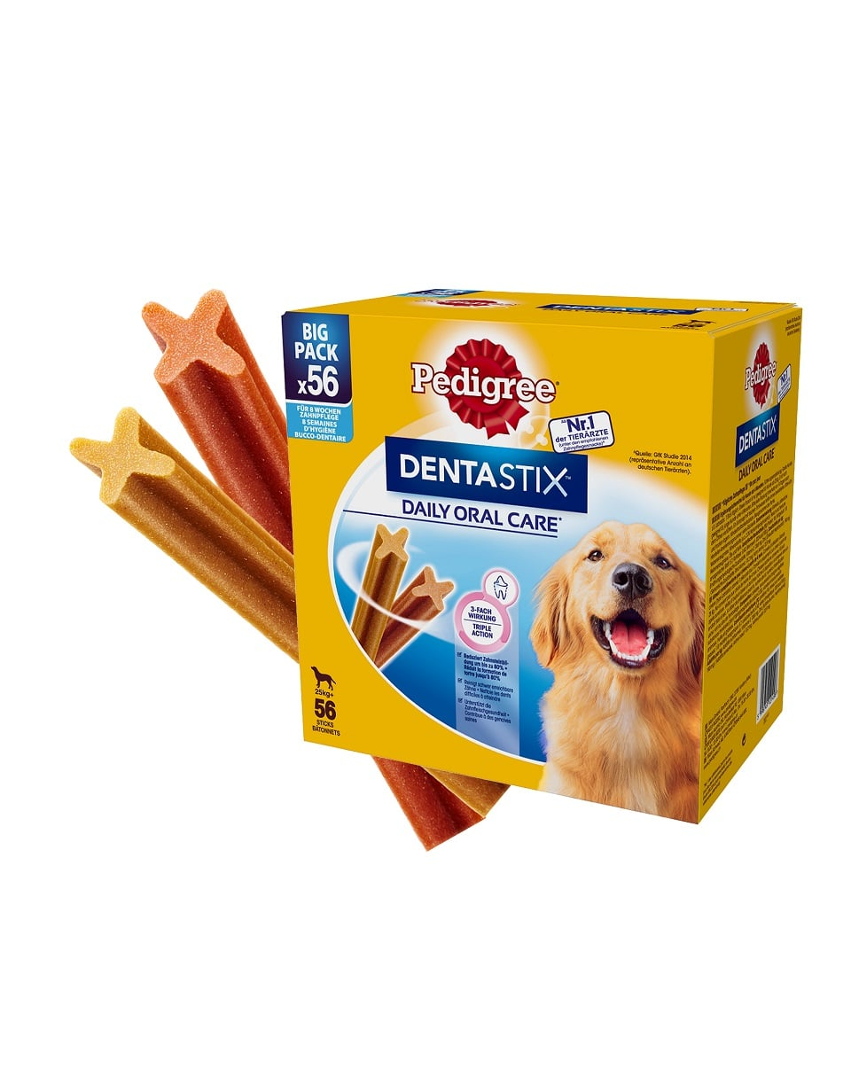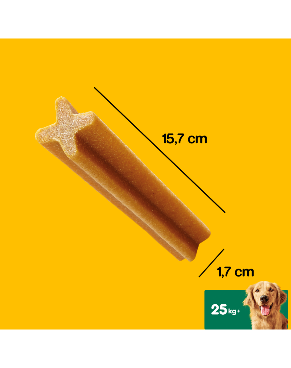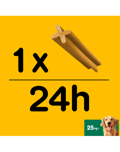A PEDIGREE DentaStix Daily Oral Care a kutyák fogkőképződésének csökkentésére szolgáló csemegék. Egyedi formájuk segít megtisztítani még a nehezen hozzáférhető fogközöket is. A speciális formula, amely alapján a PEDIGREE® DentaStix-et kifejlesztették, nemcsak a fogkő felhalmozódását távolítja el kutyája fogínyéből, hanem erősítő hatással van az ínyére is. Ez a méret a 25 kg feletti, 4 hónaposnál idősebb, nagytestű kutyák számára alkalmas.