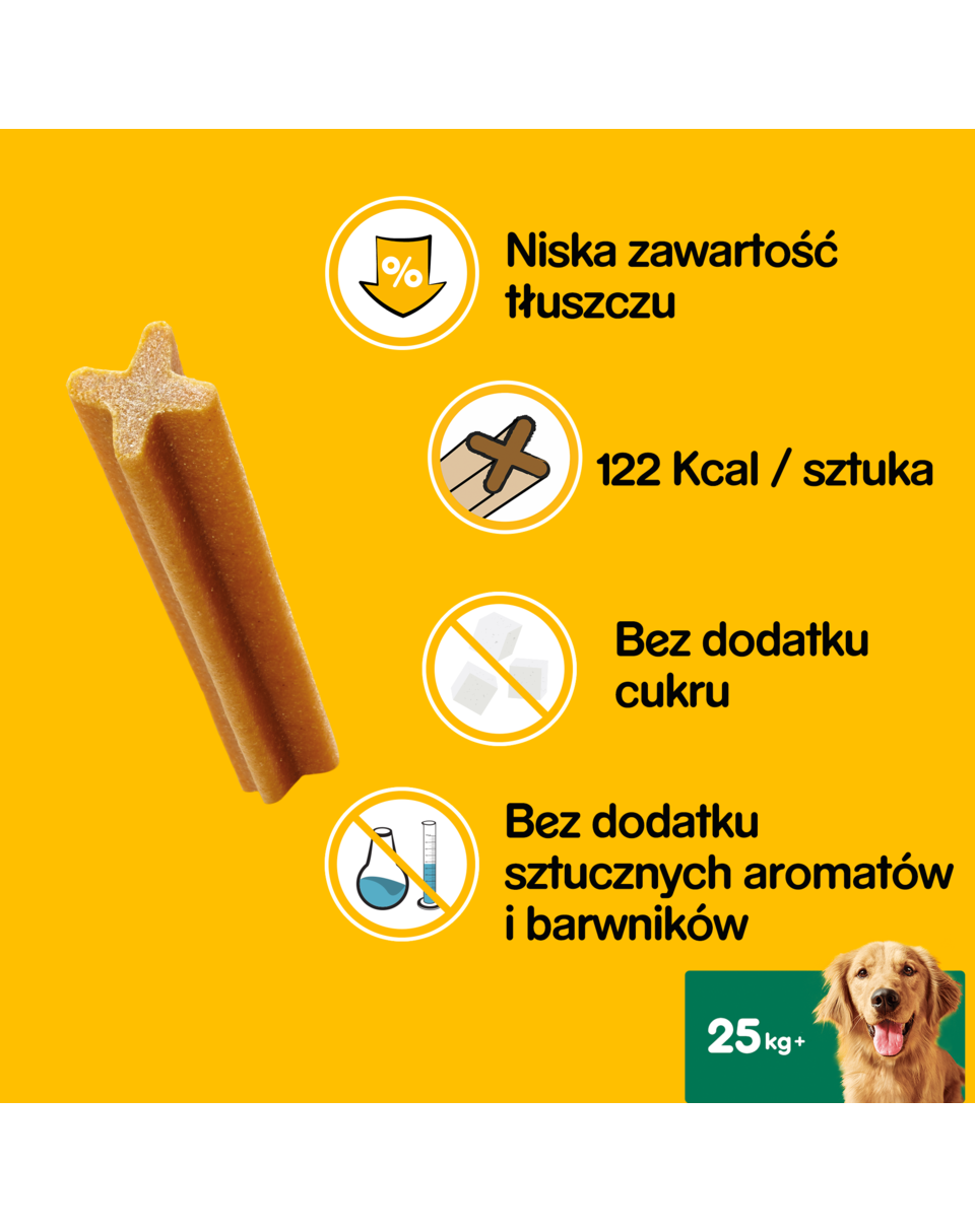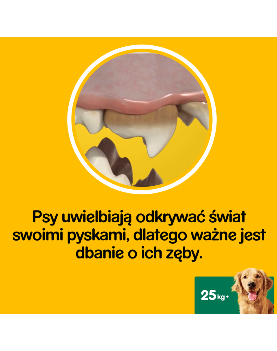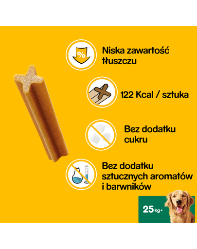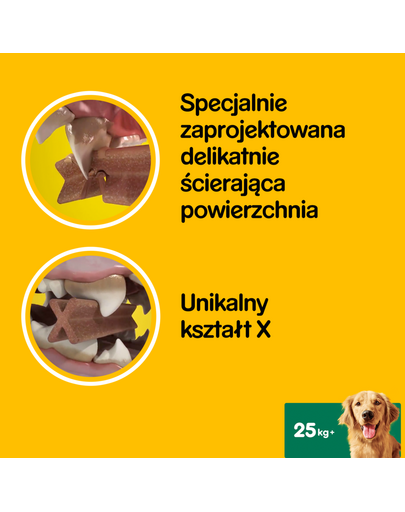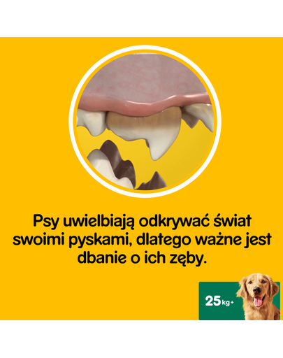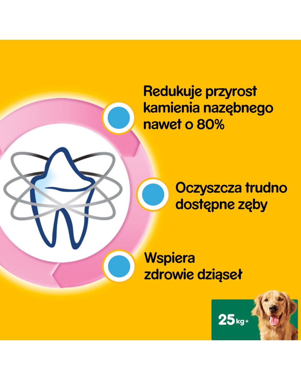 A PEDIGREE DentaStix Daily Oral Care a kutyák fogkőképződésének csökkentésére szolgáló csemegék. Egyedi formájuk segít megtisztítani még a nehezen hozzáférhető fogközöket is. A speciális formula, amely alapján a PEDIGREE® DentaStix-et kifejlesztették, nemcsak a fogkő felhalmozódását távolítja el kutyája fogínyéből, hanem erősítő hatással van az ínyére is. Ez a méret a 25 kg feletti, 4 hónaposnál idősebb, nagytestű kutyák számára alkalmas.