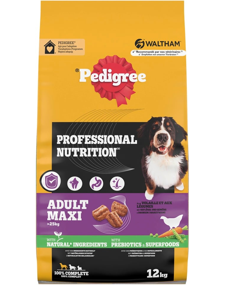 A száraz táp PEDIGREE Professional Nutrition 100%-ban teljes értékű és kiegyensúlyozott étkezés, természetes összetevőkből készült, vitaminokkal, ásványi anyagokkal és prebiotikumokkal kiegészítve – mindennel, amire minden kutyának szüksége van, hogy energikus, boldog életet élhessen. Mesterséges színezékek és ízfokozók nélkül.