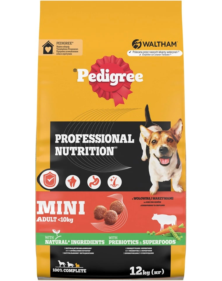 A PEDIGREE Professional Nutrition száraz táp 100%-ban teljes értékű és kiegyensúlyozott étkezés, természetes összetevőkből készült, vitaminokkal, ásványi anyagokkal és prebiotikumokkal kiegészítve – mindent tartalmaz, amire minden kutyának szüksége van ahhoz, hogy energikus, boldog életet éljen. Mesterséges színezékek és ízfokozók nélkül.