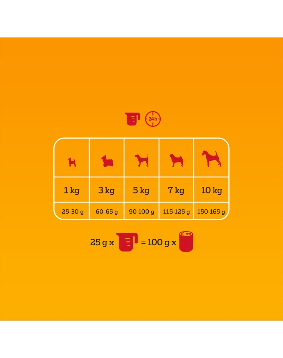 25 g száraz táp helyettesíthető 1 db 100 g-os PEDIGREE nedves táp tasakkal.