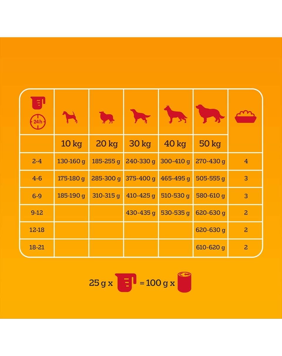 Kb. 25 g száraz tápot 100 g PEDIGREE nedves tápra lehet cserélni.