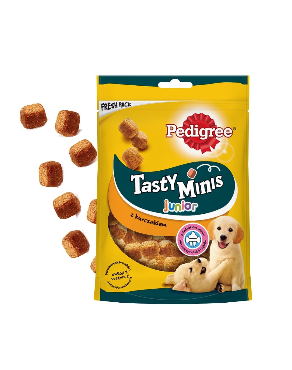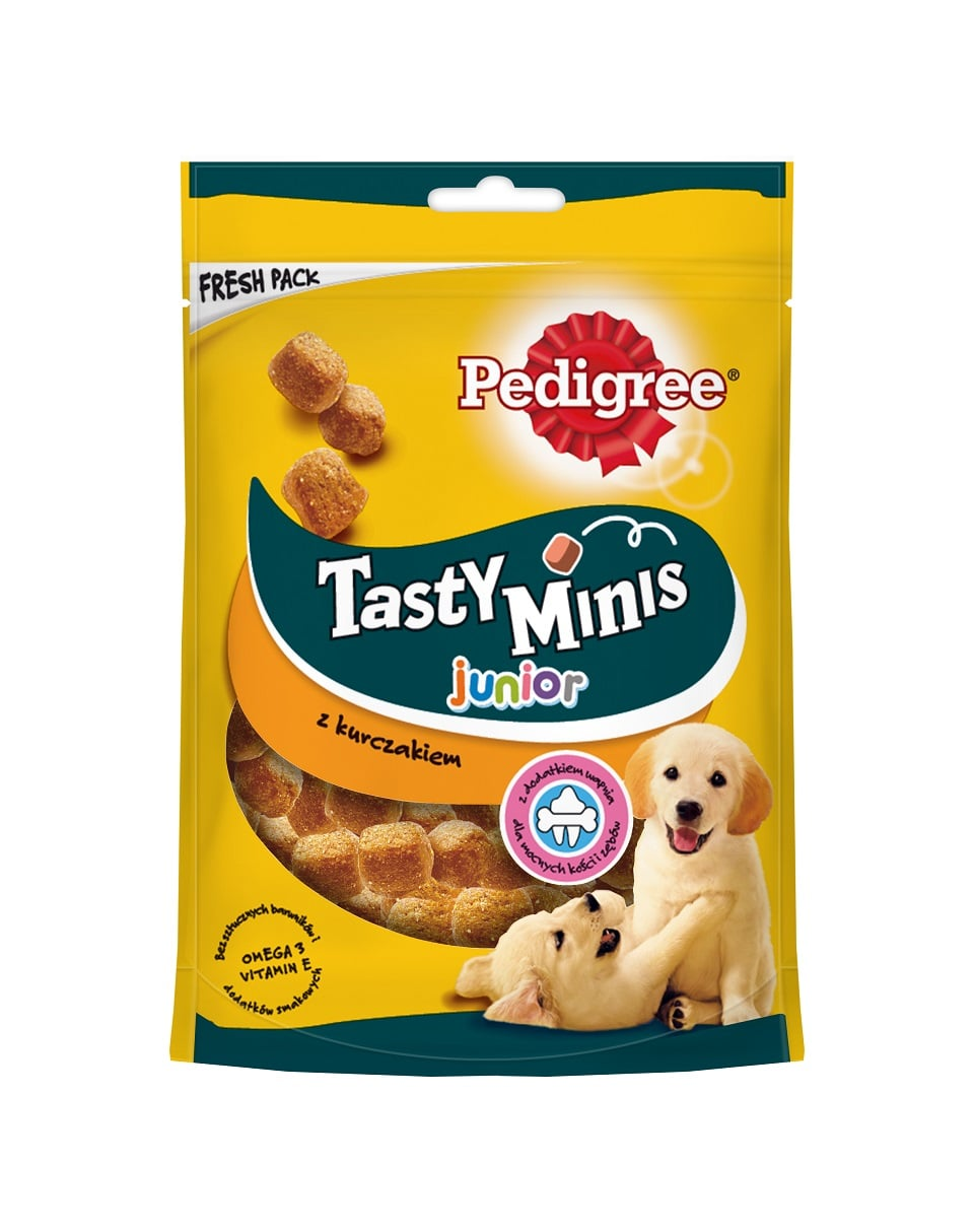 A PEDIGREE Tasty Minis Junior lédús, egyfalatos csirkés csemegék puha rágós rágcsálnivalók. Ezek az ízletes fogászati jutalomfalatokat tartalmaznak kalciumot, hogy támogassák a növekvő kölyökkutyák erős fogainak és csontjainak fejlődését. Ideális jutalomfalatnak a kiképzés során, vagy bármikor jutalomfalatnak kedvence számára! A PEDIGREE Tasty Minis húsos darabkák formájában természetes élvezetet nyújtanak kutyabarátja számára.