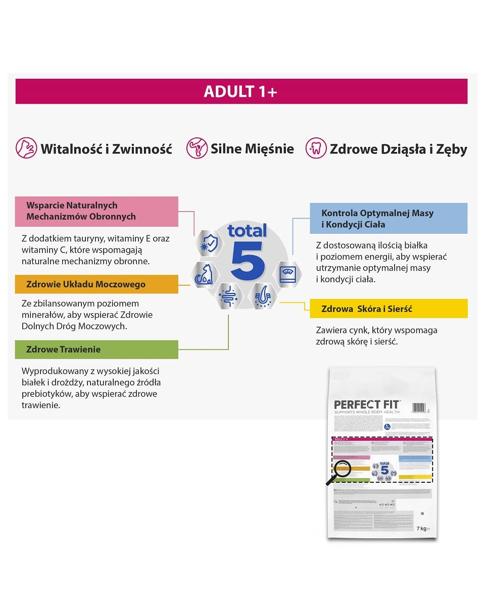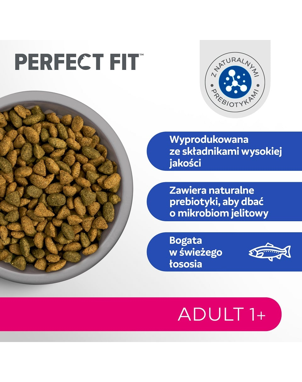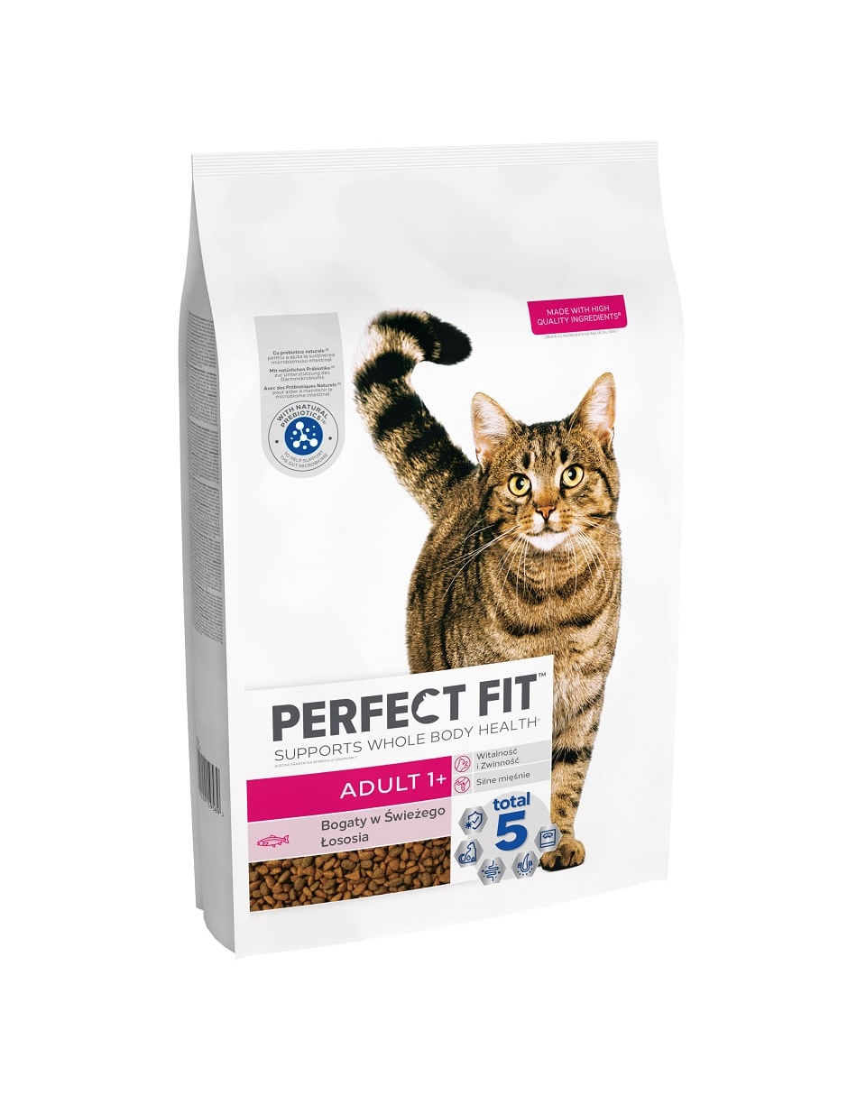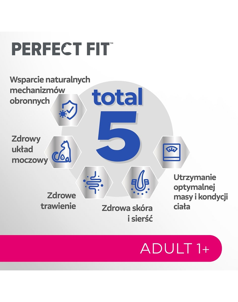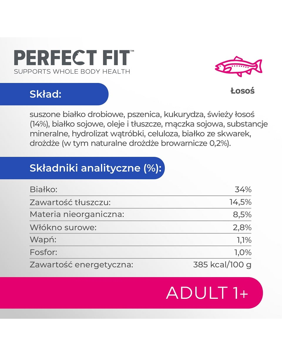 A finom Perfect Fit Adult 1+ táplálék friss lazacban gazdag, egyedülálló Total 5 formulával, amely támogatja felnőtt kedvence 5 legfontosabb egészségügyi területét: erősíti az immunrendszert, elősegíti az egészséges emésztést, az egészséges húgyutakat, az egészséges bőrt és szőrzetet, valamint az optimális testtömeg és kondíció fenntartását. A Perfect Fit Adult 1+ receptúráját állatorvosokkal és a WALTHAM Állattudományi Intézet táplálkozási szakértőivel együttműködésben fejlesztették ki, hogy a felnőtt macskák számára biztosítsa a szükséges tápanyagokat. A többi változatához hasonlóan a friss lazacban gazdag Perfect Fit Adult 1+ táplálék is további előnyökkel jár: támogatja a vitalitást és a mozgékonyságot, az erős izmokat, az egészséges ínyeket és fogakat, valamint természetes prebiotikumokat tartalmaz a bélflóra egészségének megőrzése érdekében. Ha ezt a táplálékot választja kedvencének, biztos lehet benne, hogy a Perfect Fit egyedülálló összetétele támogatja macskája egész szervezetének egészségét, és olyan további egészségügyi előnyöket biztosít, amelyek kifejezetten az életkorához és egyéni igényeihez vannak igazítva.
