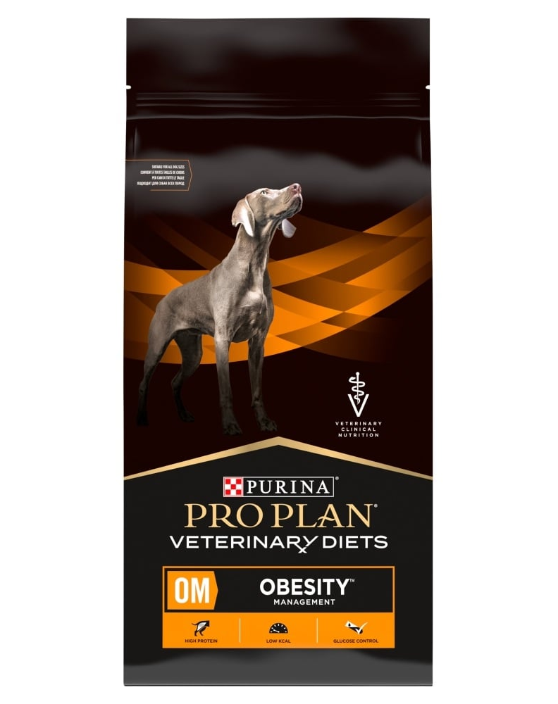 PURINA PRO PLAN Veterinary Diets Canine OM Obesity Management egy teljes értékű diétás eledel felnőtt kutyák számára, amelyet túlsúly csökkentésére vagy cukorbetegség esetén a vércukorszint szabályozásának támogatására fejlesztettek ki. A receptúra alacsonyabb energiasűrűséggel és alacsony egyszerűcukor-tartalommal (mono- és diszacharidok) rendelkezik, ami lehetővé teszi a biztonságos és kontrollált testsúlycsökkentést.