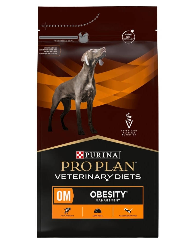 PURINA PRO PLAN Veterinary Diets Canine OM Obesity Management egy speciális állatorvosi diéta felnőtt kutyák számára, amelyet a túlsúly csökkentésére és a vércukorszint stabilizálásának támogatására fejlesztettek ki, különösen cukorbeteg kutyák esetében. A táp alacsony energiatartalommal és alacsony, könnyen felszívódó cukortartalommal rendelkezik, ami elősegíti a kontrollált zsírégetést, miközben segít megőrizni az izomtömeget.