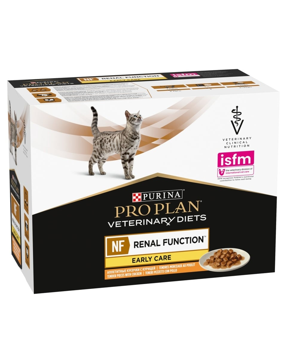 PURINA PRO PLAN Veterinary Diets Feline NF Renal Function Early Care egy teljes értékű nedves diétás eledel, amelyet felnőtt macskák számára fejlesztettek ki, akik krónikus vesebetegség korai stádiumában szenvednek. A formula úgy lett megtervezve, hogy támogassa a vesék működését és lassítsa a betegség progresszióját a magas minőségű fehérje mérsékelt szintjével és a foszfor korlátozott szintjével.