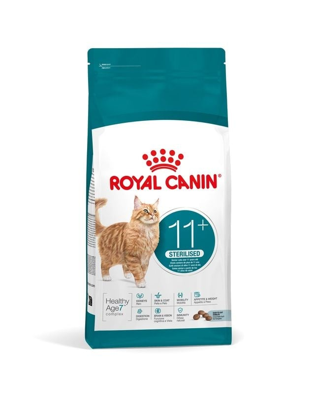 ROYAL CANIN Ageing Sterilised 11+ egy teljes értékű eledel ivartalanított/kastrált idősebb macskák számára 11 éves kor felett.
