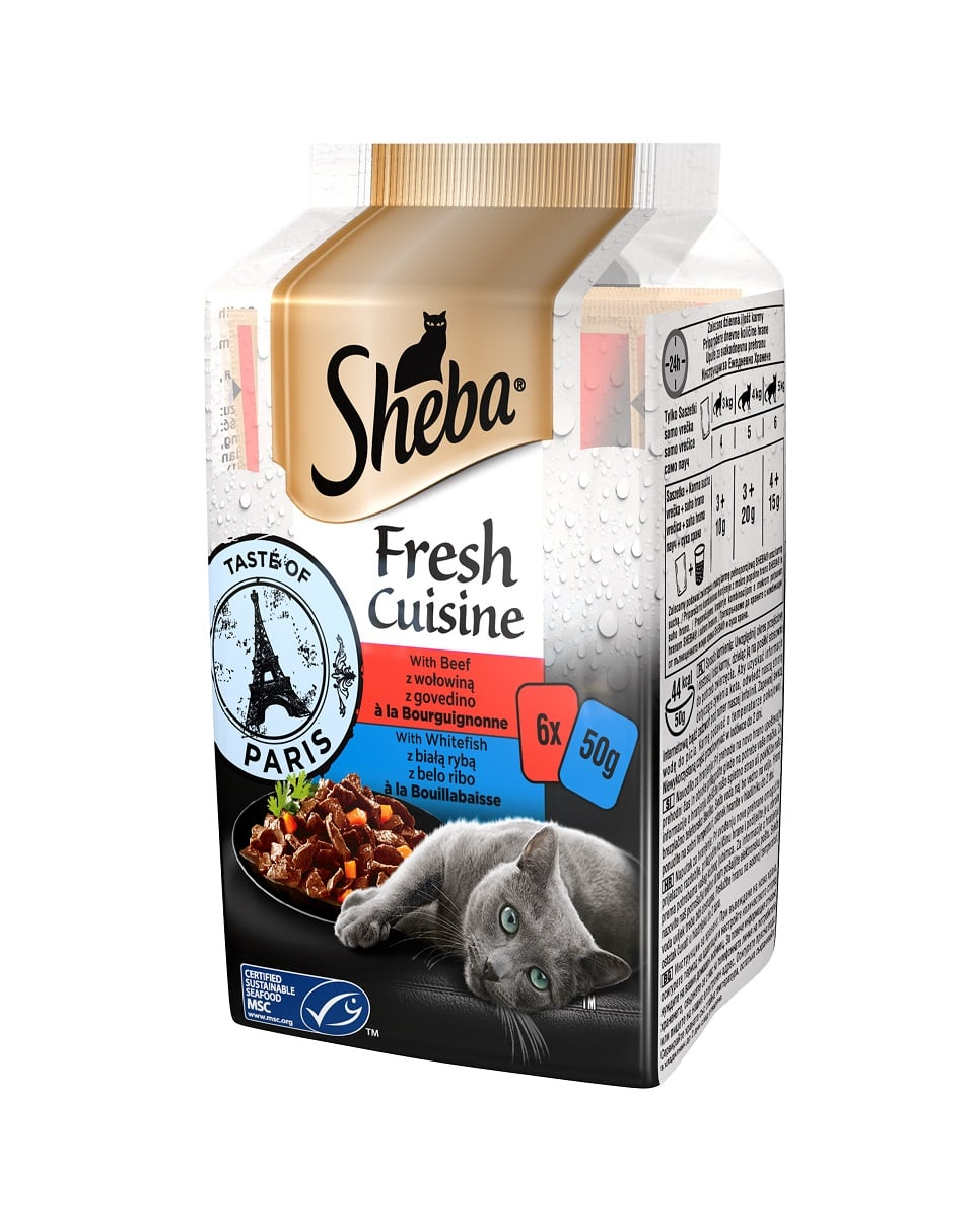 ASHEBA Fresh Cuisine teljes értékű és kiegyensúlyozott eledel felnőtt macskák számára. Élvezni fogják a finom pelyhek étvágygerjesztő keverékét. A tasakos forma biztosítja, hogy mindig legyen egy friss adag eledel, kényelmesen tálalható. A SHEBA Fresh Cuisine készlet 2 ízben tartalmaz eledelt: marhahús és fehér hal. Gyönyörködtesse macskáját a világ kulináris metropoliszai által ihletett eledellel. A SHEBA mindennapos etetésével biztos lehet benne, hogy kedvence egészségesen és ízletesen táplálkozik.