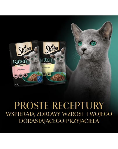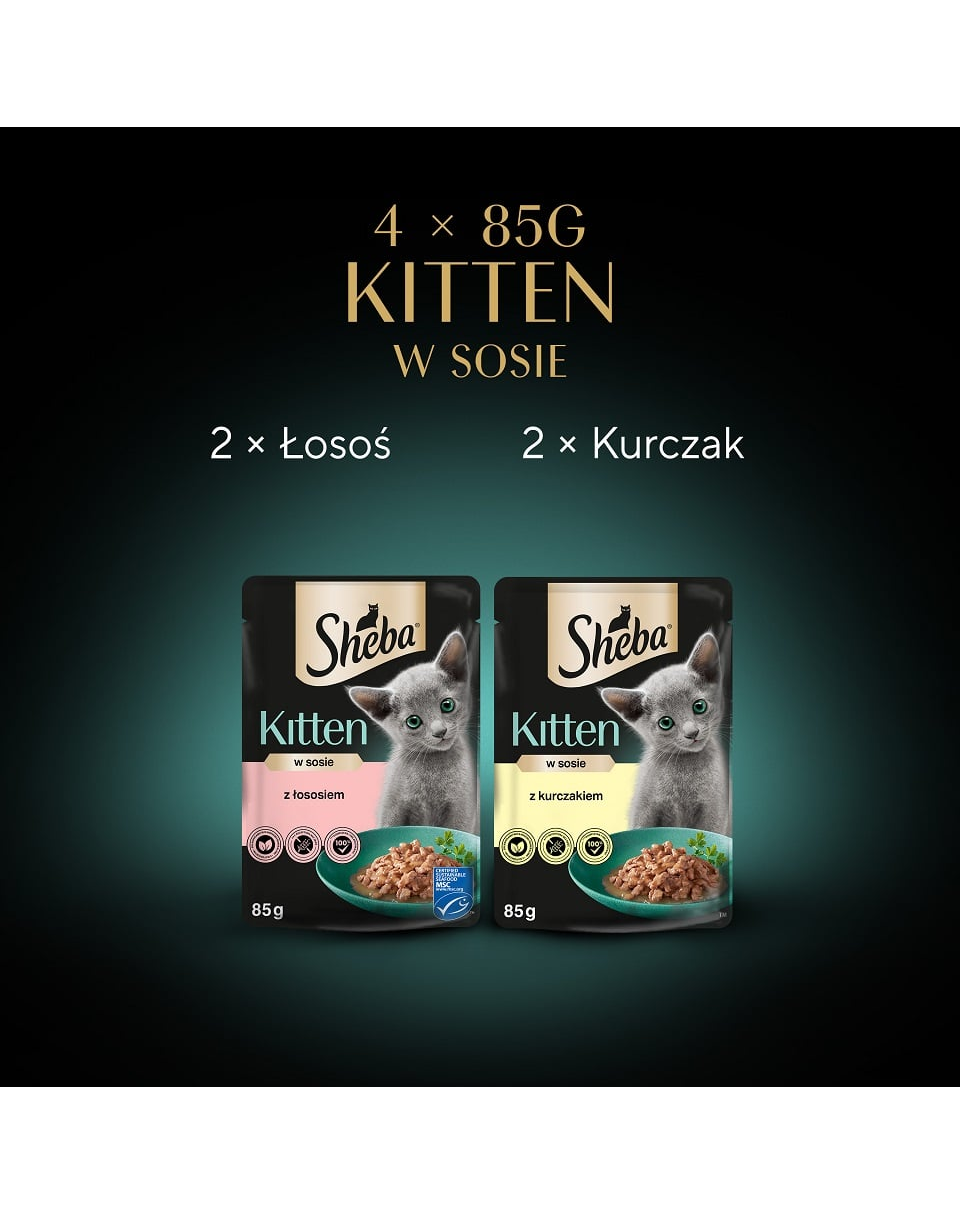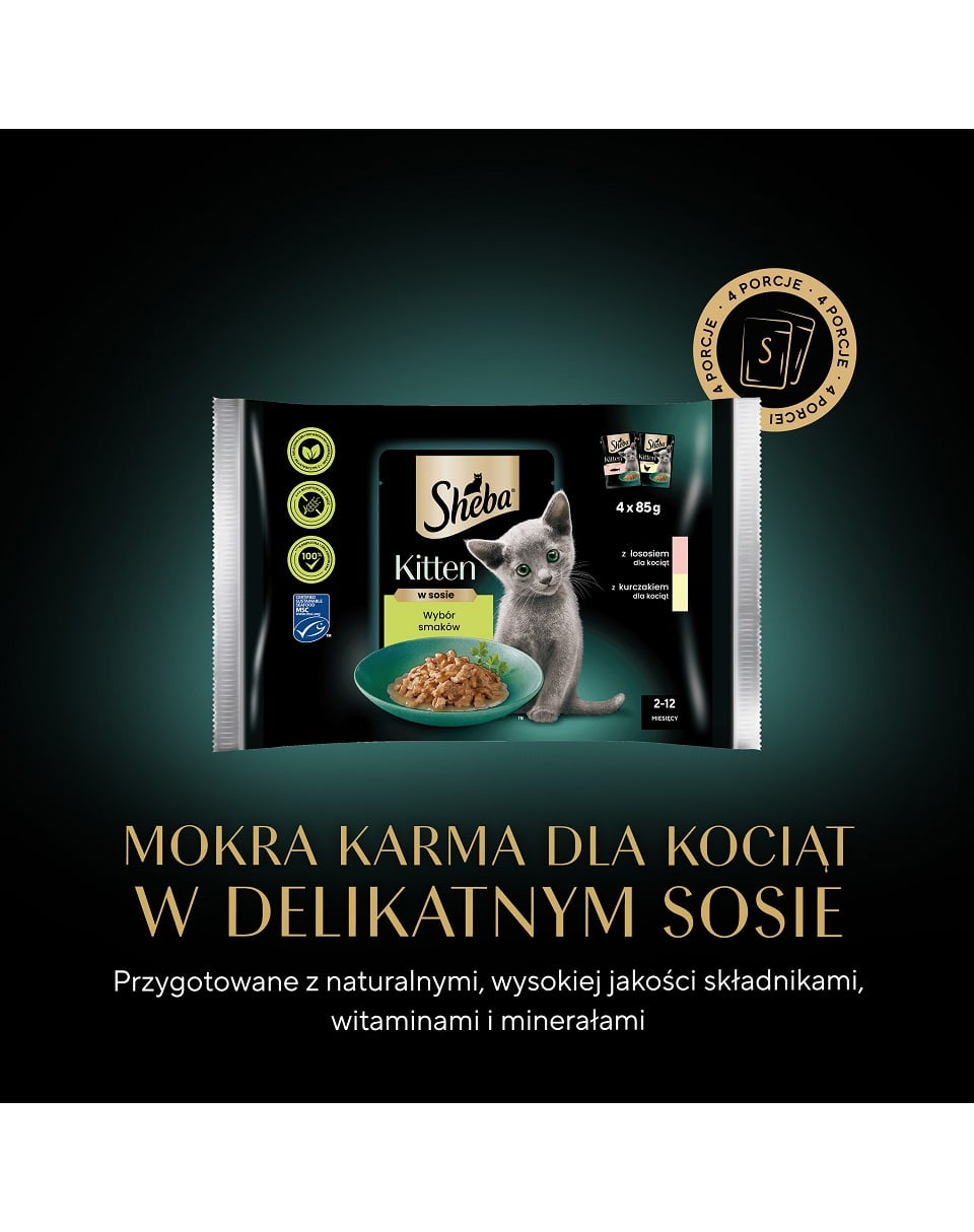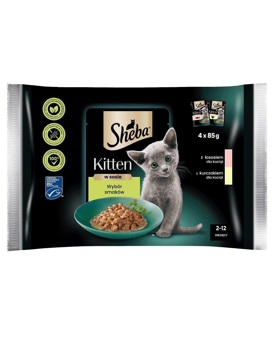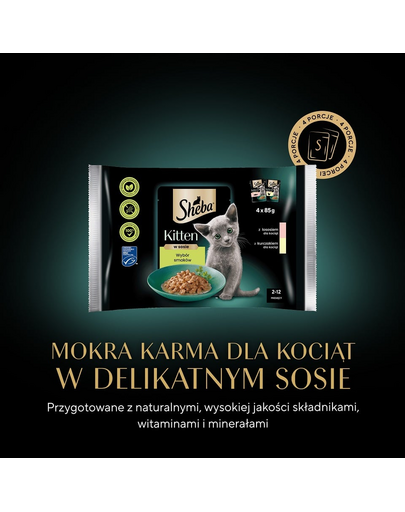 A Sheba Kitten Choice of Flavours gondosan válogatott, zsenge darabok keveréke ízletes mártásban. Az egyszerű receptek támogatják növekvő barátja egészséges növekedését. Puha darabokból álló étkezési javaslat, lazaccal és csirkehússal, ideális a tejfogak számára, és tökéletesen a kis szájakhoz igazodik. A Sheba® Kitten Selection of Flavours mesterrecept titka a kiváló minőségű természetes összetevőkben, valamint a vitaminokban és ásványi anyagokban rejlik. Kifejezetten fejlődő cicák számára összeállított eledel, amely támogatja immunrendszerüket, erős csontjaikat és növekvő izmaikat. Engedje, hogy növekvő macskája kulináris élvezetekben gyönyörködjön az ízletes Sheba® Kitten Selection of Flavours eledellel, amely még a legnyűgösebb étvágyat is kielégíti.