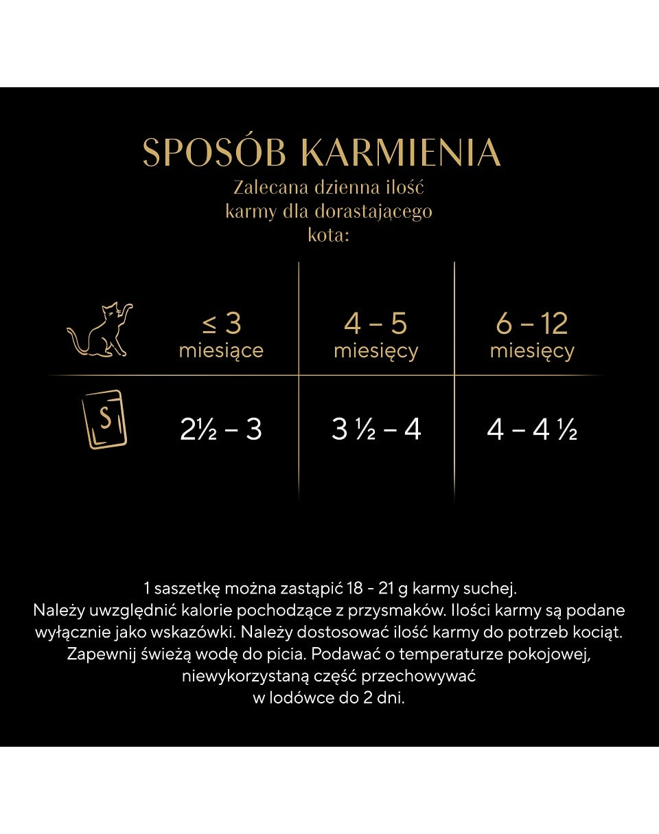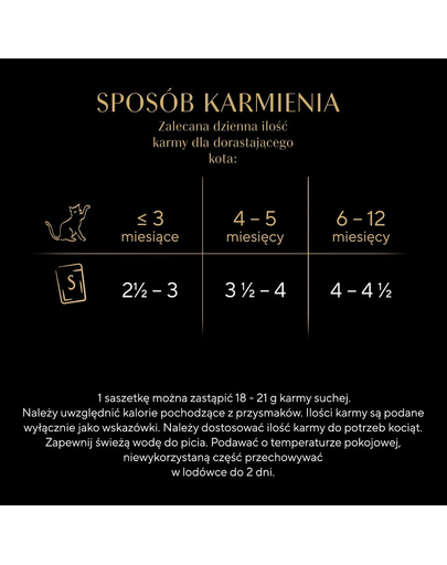 Egy ≤ 3 hónapos cicának naponta 2,5-3 tasakra van szüksége.
