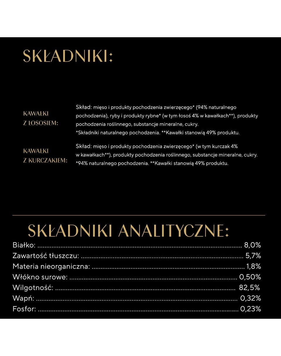 Darabkák lazaccal: Összetevők: hús és állati eredetű termékek* (94%-ban természetes eredetű), hal és haltermékek* (beleértve a lazac 4% darabokat**), növényi eredetű termékek, ásványi anyagok, cukrok. *természetes eredetű összetevők. **A darabolt hal a termék 49%-át teszi ki.