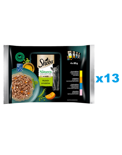 ASHEBA Nature's Collection ízválaszték egy teljes értékű nedves eledel macskák számára négy ízben. Praktikus tasakba zárva, ideális egy adagra, finom darabok aromás mártásban: paradicsommal díszített csirkével és lenmagolajjal, sárgarépával és borsóval díszített pulykával, sárgarépával és borsóval díszített tonhallal és lenmagolajjal, sárgarépával és borsóval díszített lazaccal, sütőtökkel és paszternákkal díszítve. Az ételek úgy lettek elkészítve, hogy még a legválogatósabb macska ízlését is kényeztessék. A Sheba Nature's Collection receptjének titka a gondosan válogatott, kiváló minőségű természetes összetevők, valamint a vitaminok és ásványi anyagok. Az ételek gabonaféléktől, mesterséges aromáktól és színezékektől mentesek.