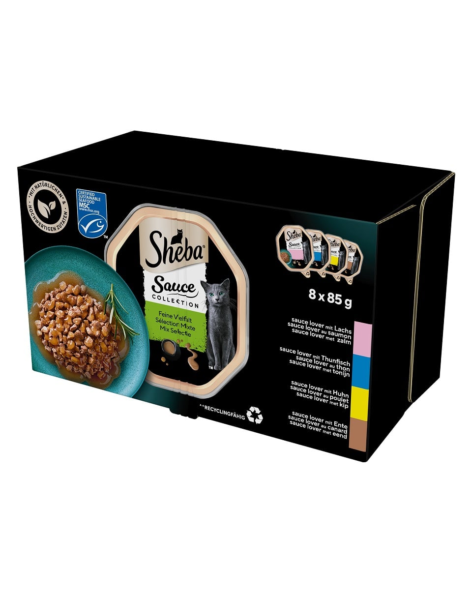 A Sheba Sauce Collection Selection of Flavours gondosan válogatott darabok keveréke bársonyos mártásban. Az étkezési javaslat 4 ízvariációban, darabokban: lazac, tonhal, csirke, kacsa, még a legigényesebb macskák ízlését is megörvendezteti. A Sheba Sauce Collection Selection of Flavours mesteri receptjének titka a kifinomult összetevőkben, valamint a vitaminokban és ásványi anyagokban rejlik. Minden tálca olyan tápanyagokat tartalmaz, amelyek támogatják macskája megfelelő működését. Engedje meg macskájának a kulináris élvezetet, hogy elkényeztesse a Sheba® Sauce Collection Selection of Flavours finomságait, amelyek még a legnyűgösebb étvágyat is kielégítik.